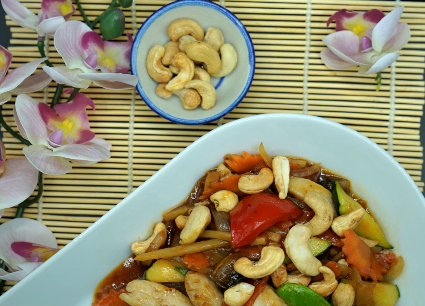 Wok med søt chillipaste, østersaus, grønnsaker og cashewnøtter. Serveres med ris. (G,F,N,S)