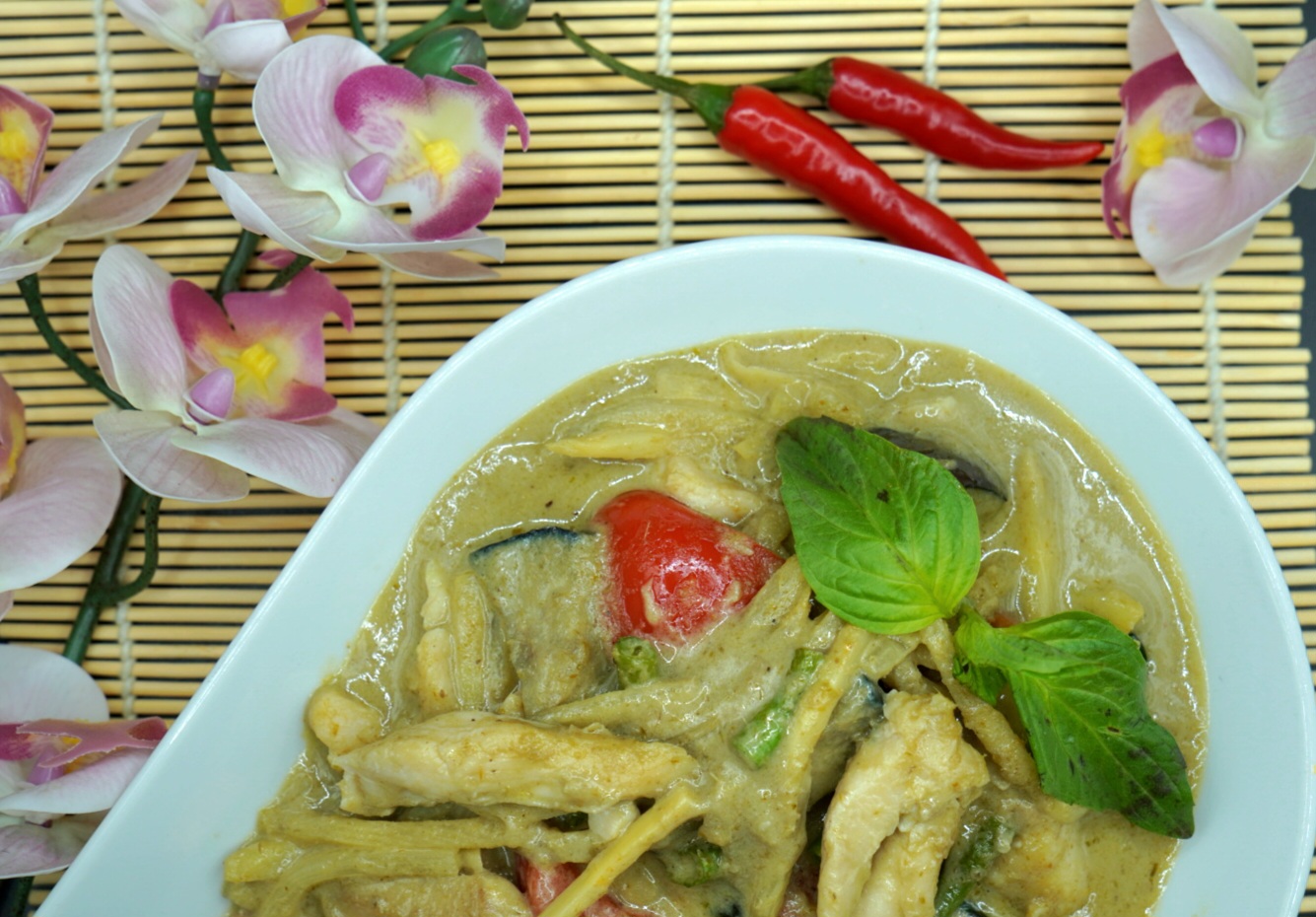 Panang curry med kokosmelk, thai basil, keffirlimeblad og grønnsaker. Serveres med ris. (SK)