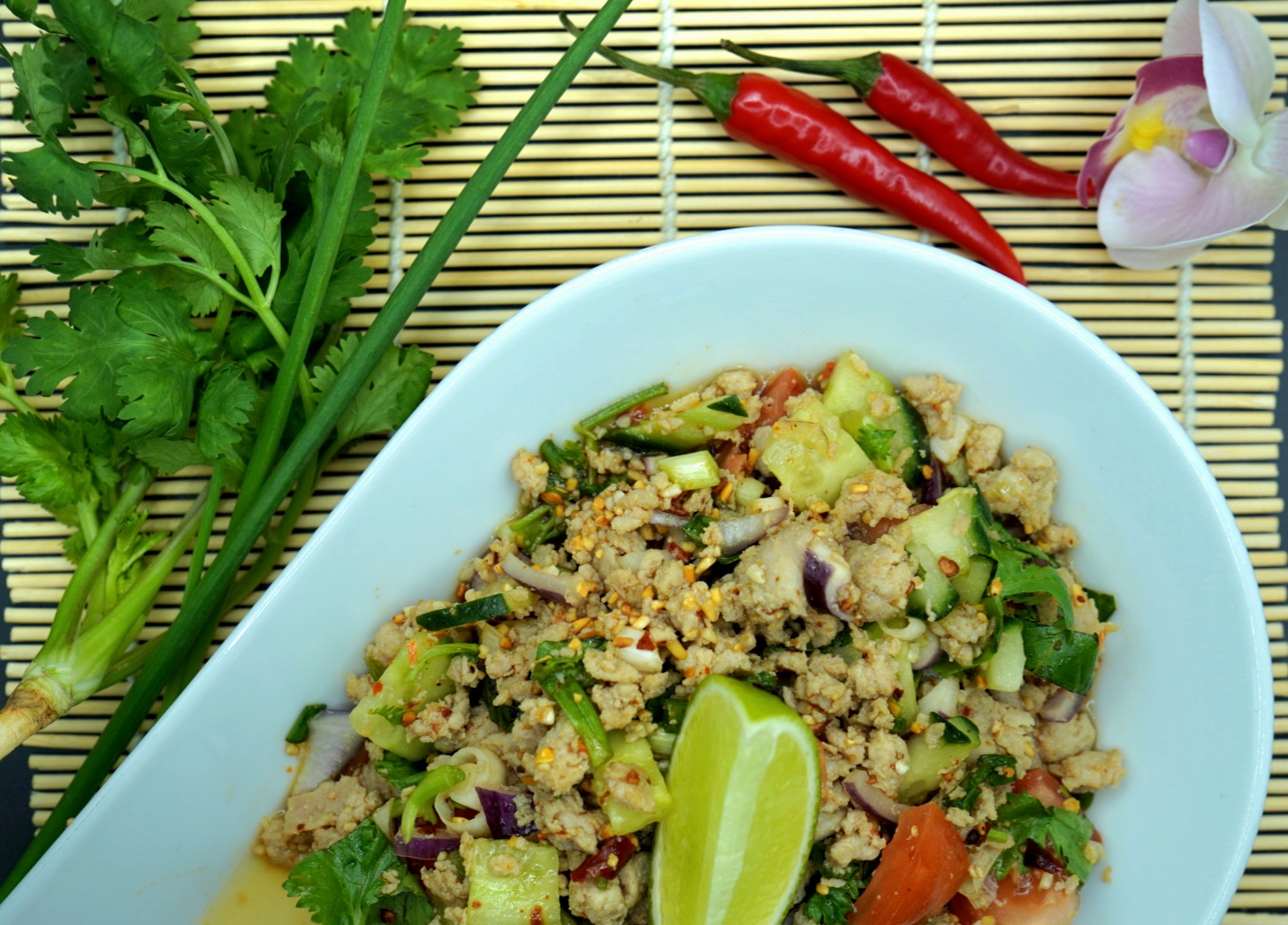 Thai-salat av kyllingkjøttdeig med chilli, limejuice, vårløk og koriander. Serveres med ris.