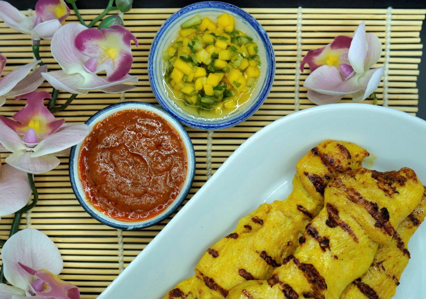 Grillet marinert kyllingfillet med peanutsaus og mangosalat. (P,S,SK, SENNEP)