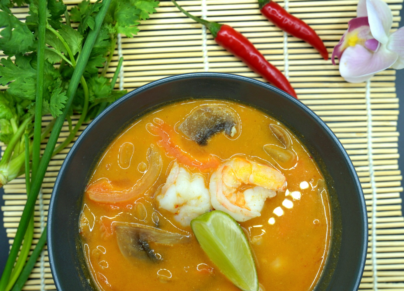 Sterk og syrlig Tom Yum Scampisuppe med kokosmelk, galangal, sitrongress, kaffirlimeblad, limejuice og grønnsaker. (SK,S)