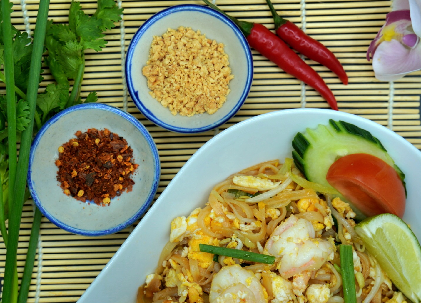 Klassisk thai-stekte risnudler med pad thai saus, soyasaus, egg, bønnespirer, vårløk, og peanøtter. (G,F,E,P,S)