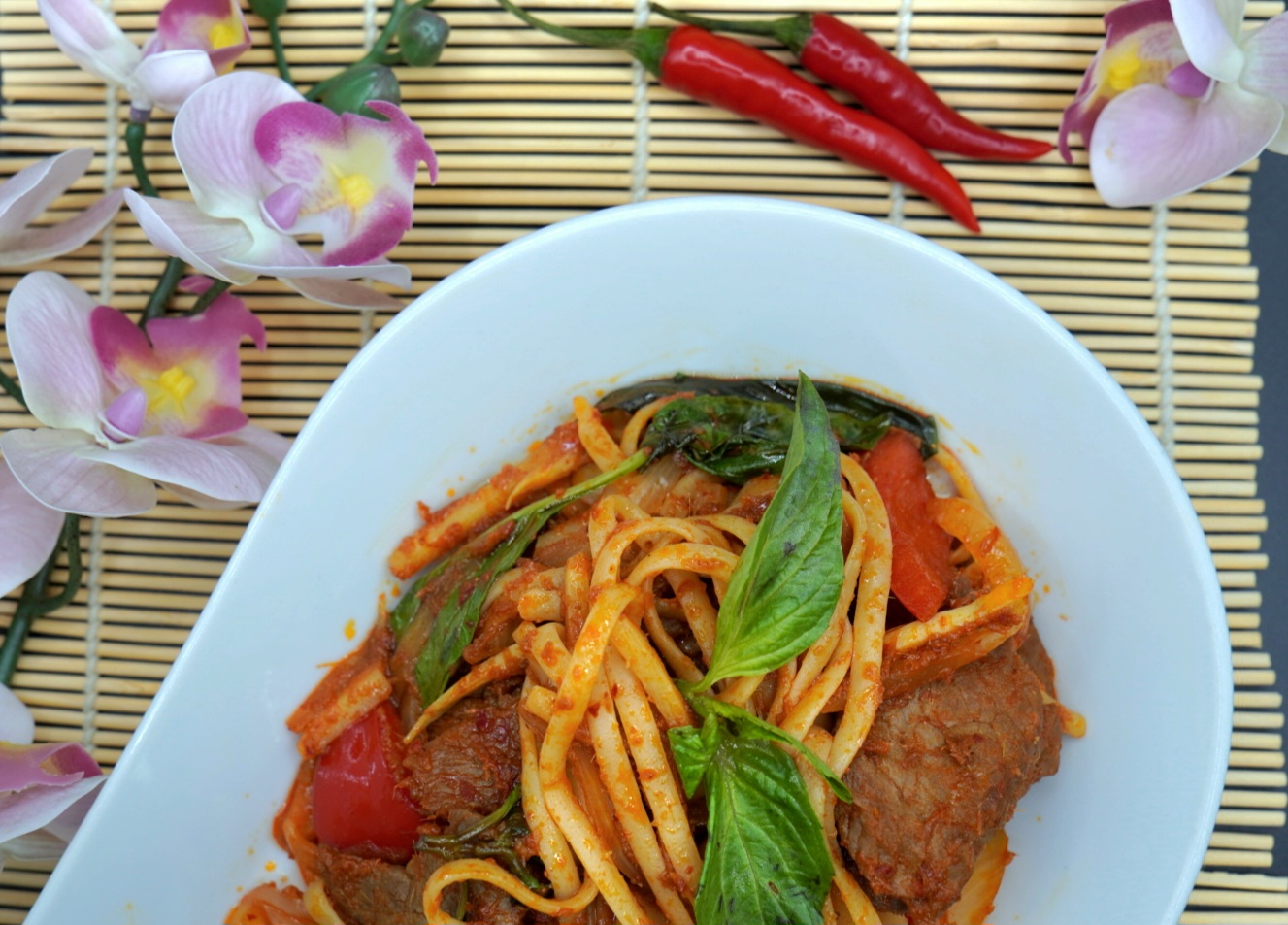 Wok med chillipaste, spagetti, grønnsaker og kaffirlimeblad. (G,SK,S)