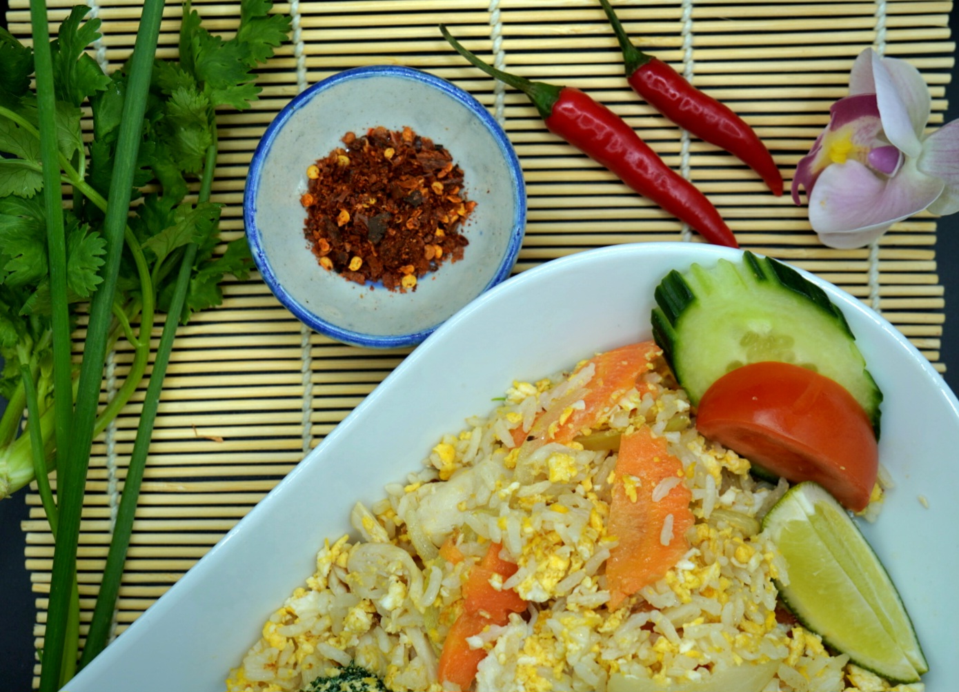 Stekt ris med egg og grønnsaker. (G,E,S)